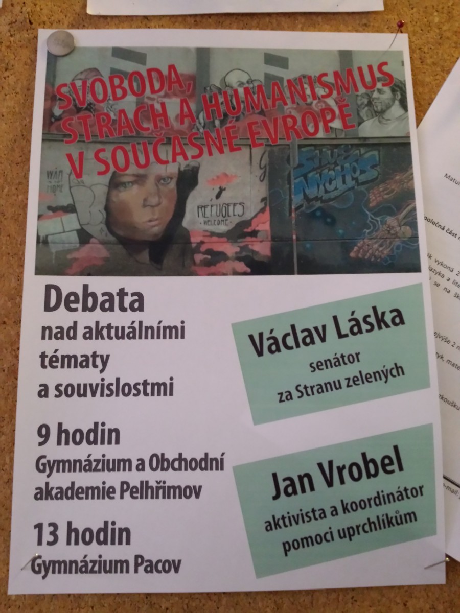 V pondělí 7. prosince proběhla ve školním klubu beseda na téma uprchlická krize. Na pacovské gymnázium přijeli diskutovat Václav Láska, senátor za Stranu zelených, a Jan Vrobel, aktivista a koordinátor pomoci uprchlíkům. Oba hosté studentům představili své názory na způsob řešení krize a také vlastní zkušenosti. Během téměř dvouhodinové besedy byly diskutovány otázky spojené s řešením aktuální situace, v debatě došlo na obavy z šíření islámské kultury, na otázky týkající se finančních nákladů spojených s asimilací uprchlíků, na strach ze šovinismu a radikalizace české společnosti, kterým je potřeba čelit.