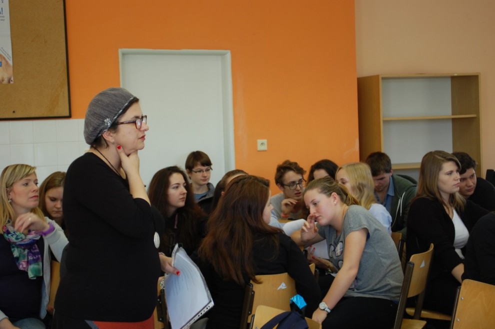 V pondělí 16. listopadu 2015 zavítala na naše gymnázium Mgr. Miriam Mouryc z izraelské Mezinárodní školy pro výuku o holocaustu v Jeruzalémě (The International School for Holocaust Studies), aby se studenty septimy a oktávy vedla besedu na téma antisemitismus a holocaust. Cílem diskuse bylo seznámit studenty s různými aspekty odboje v totalitním režimu a umožnit jim pochopit význam hrdinských činů, kterých se dopouštěli „obyčejní“ lidé z různých společenských vrstev. Studenti se seznámili s příběhy několika lidí, kteří zachránili život mnoha Židům. Paní Miriam Mouryc představila studentům titul „Spravedliví mezi národy“, který je udílen osobám nežidovského původu, jež se zasloužily o záchranu Židů před holocaustem.