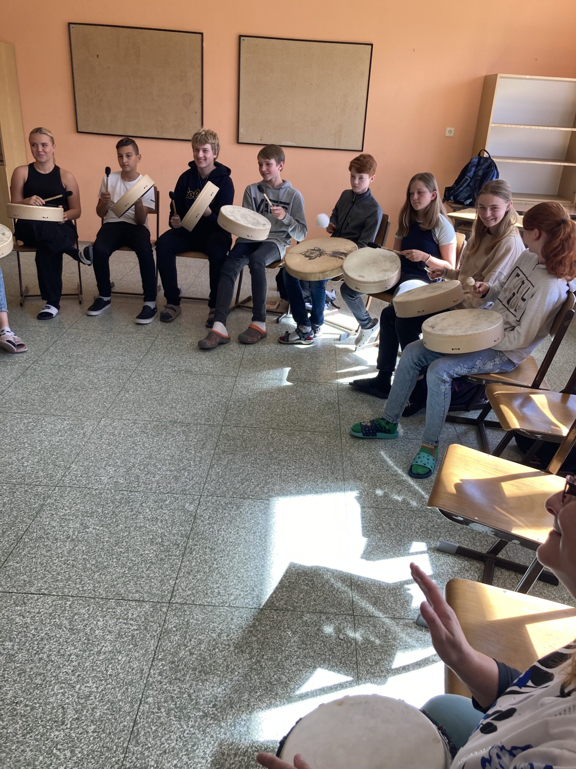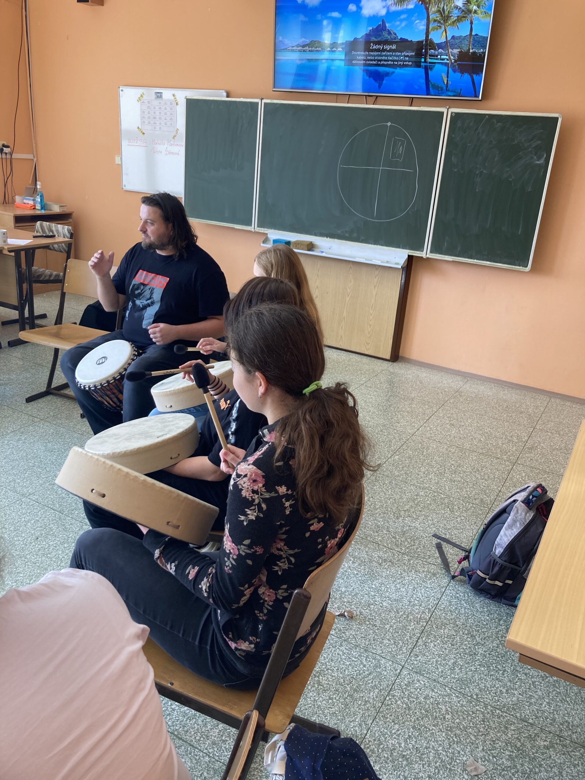 Bubnování je jako život – je to hra :-). Tohle motto provázelo studenty tercie v rámci bubenické dílny v hodinách hudební výchovy. Leadrem a rytmickým šamanem se na dvě čtvrteční poobědní lekce stal Lukáš Vídeňský. Od srdečního rytmu přes jamajské houpavé reggae až po bubenické skandování jmen studentů. Od prvního ostychu až po hlasitá improvizovaná sóla. Zábava i trénink mozkových hemisfér. Na skok do pravěku a zpátky do rockového nářezu. Díky, těšíme se na pokračování!