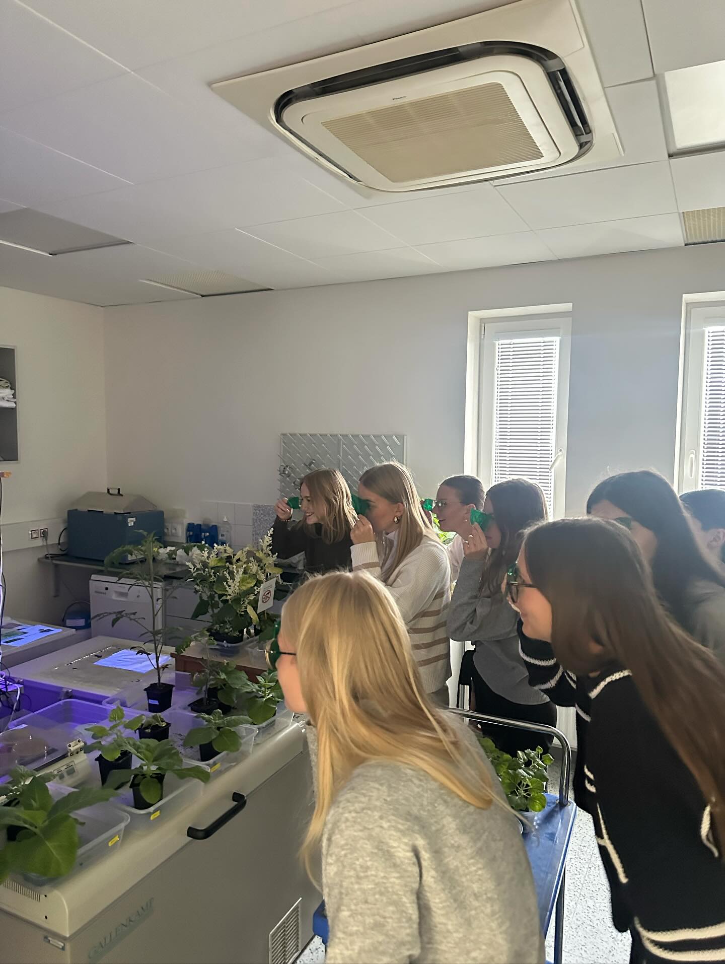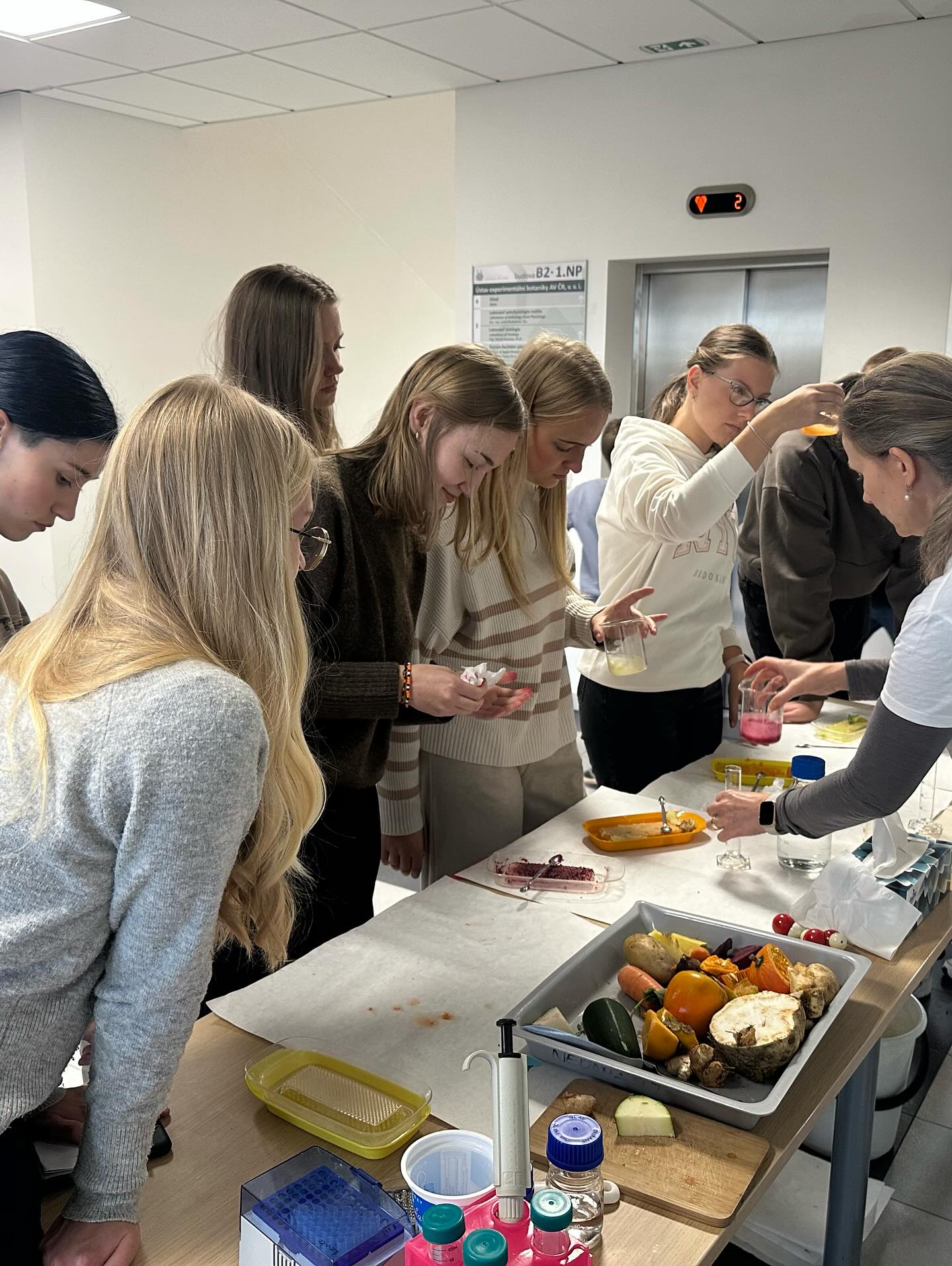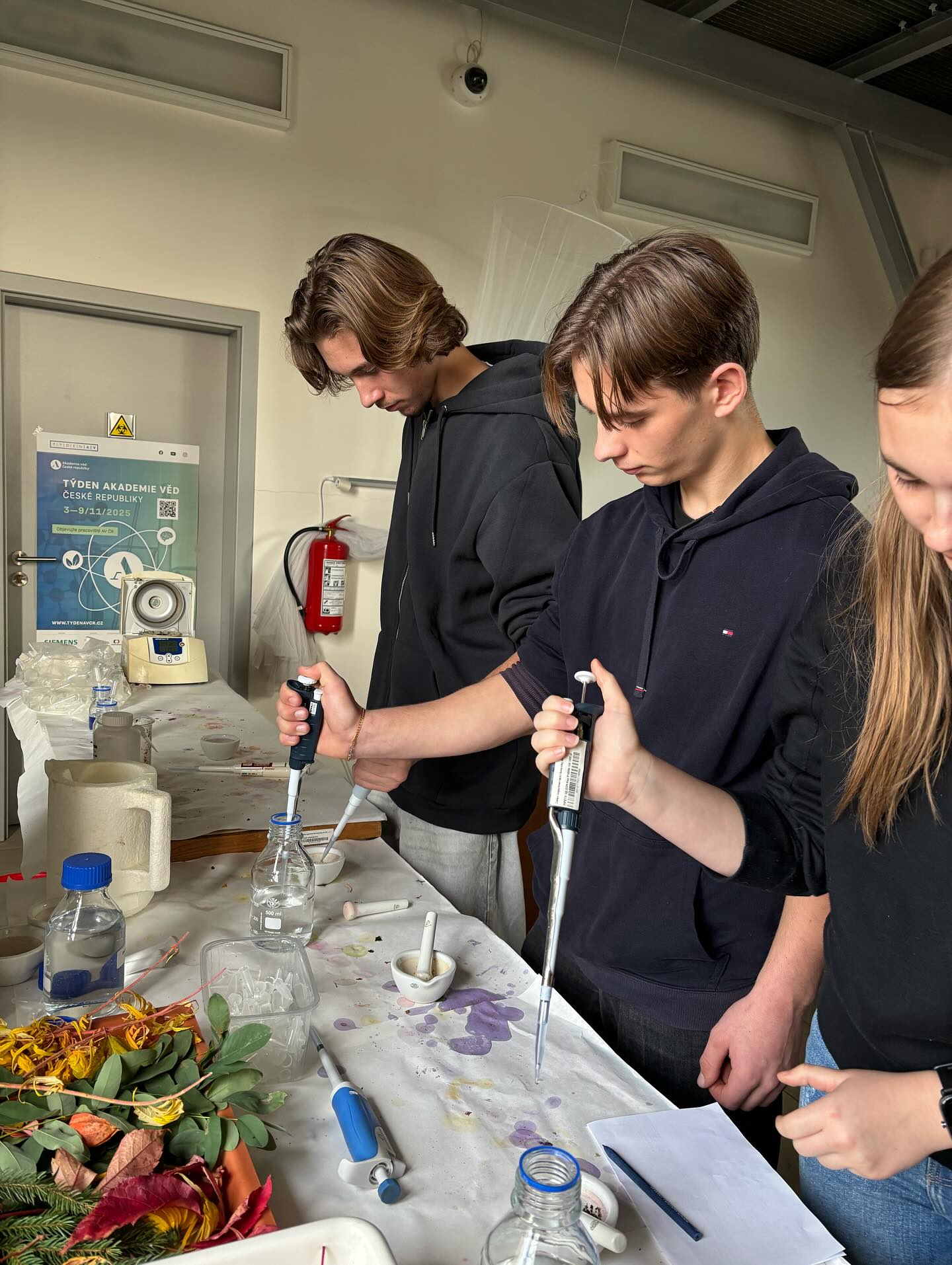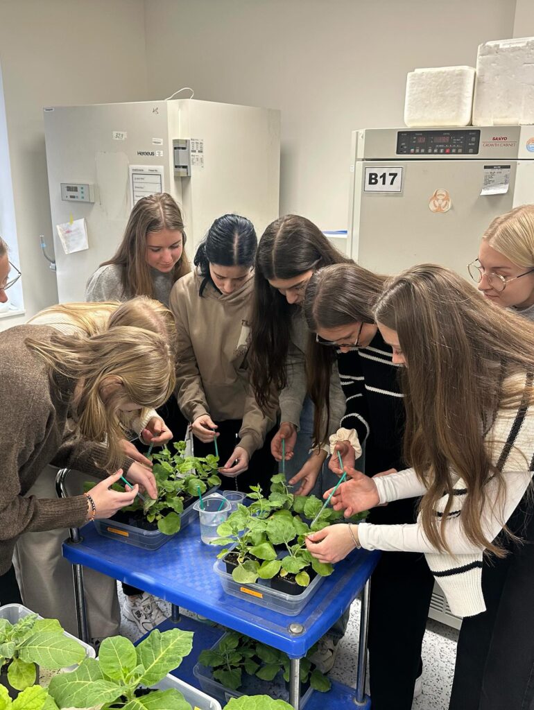 V úterý 4.11.2025 se studenti kvinty a biologického semináře septimy a oktávy seznámili s laboratořemi UEB AV ČR. Vědci jim ukázali svoje pracoviště, vysvětlili jak funguje hmotnostní spektrometr, konfokální mikroskop, mrazící box nebo elektroforéza. Mohli si sami vyzkoušet práci s automatickou pipetou, s binokulární lupou, dokázat enzymy v rostlinách nebo prohlédnout nový skleník s moderními technologiemi. Během pobytu studenti vyplňovali kvíz s úkoly, které byly umístěny po celé budově. A za odměnu si mohli vybrat rostlinu nebo tričko s obrázkem.