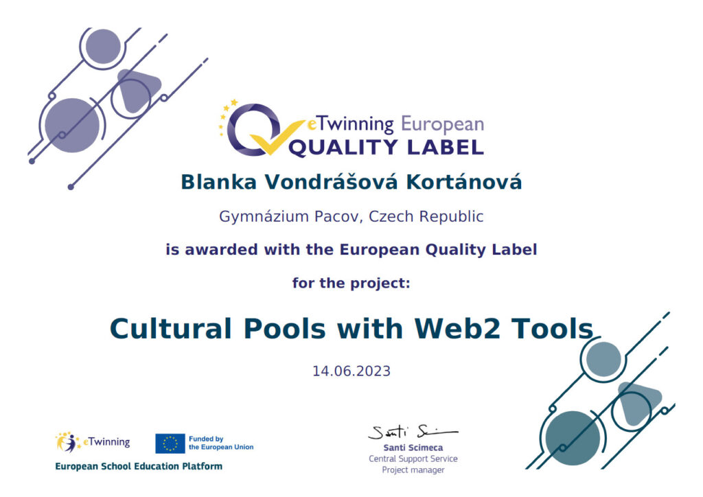 Naše škola získala díky práci dnešní třídy septimy Evropskou cenu kvality za svůj eTwinningový projekt „Cultural Pools with Web2 Tools“. Toto ocenění získávají projekty mezinárodní spolupráce, kdy byly cenou kvality oceněné všechny zúčastněné země daného projektu. V našem případě se jednalo o Gymnázium Pacov spolupracující se školami z Rakouska, Chorvatska a Turecka.