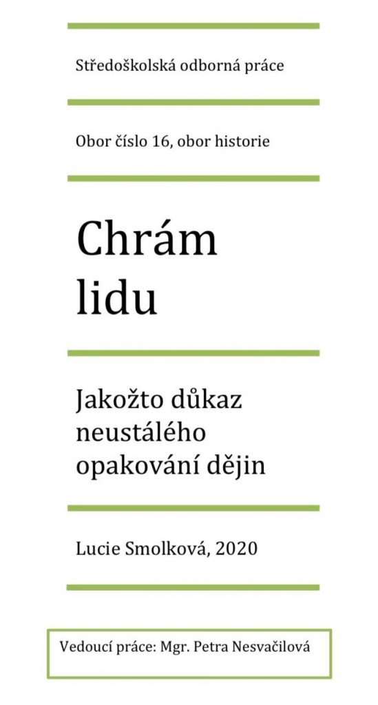 Dnes 7.5. 2020 vyhrála studentka septimy Lucie Smolková Krajské kolo soutěže Středoškolská odborná činnost. V oboru historie zpracovala práci s názvem „Chrám lidu, jako důkaz neustálého opakování lidských dějin“, která se věnuje psychologicko-historickému rozboru kalifornské sekty. Tato detailní analýza probíhala na pozadí historických událostí a využila srovnání např. s prvky totalitních režimů. Naše studentka tak prokázala výbornou badatelskou činnost a unikátní práci s dosud nevyužitými prameny.