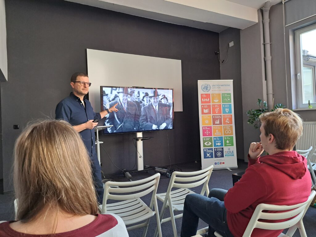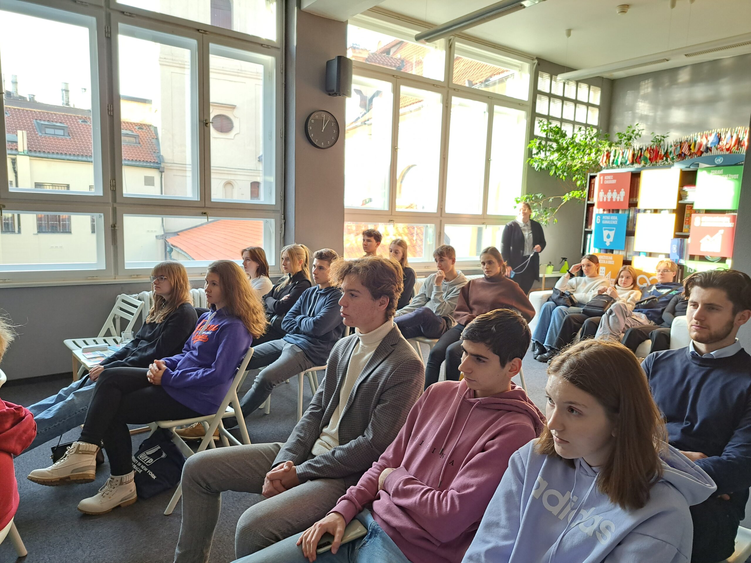 Po krátké procházce Prahou z Malostranského náměstí přes Karlův most jsme dorazili do Informačního centra OSN v Praze, kde nás čekala druhá část dnešního programu. Ujal se nás zde vedoucí kanceláře, pan Michal Broža, aby studenty seznámil s činností největší mezinárodní organizace na světě. Po úvodu týkajícím se hlavních cílů této organizace a změnách, kterými za svou existenci prošla, se pozornost zaměřila na mírovou činnost a možnosti, kterými OSN při řešení mezinárodních konfliktů disponuje.