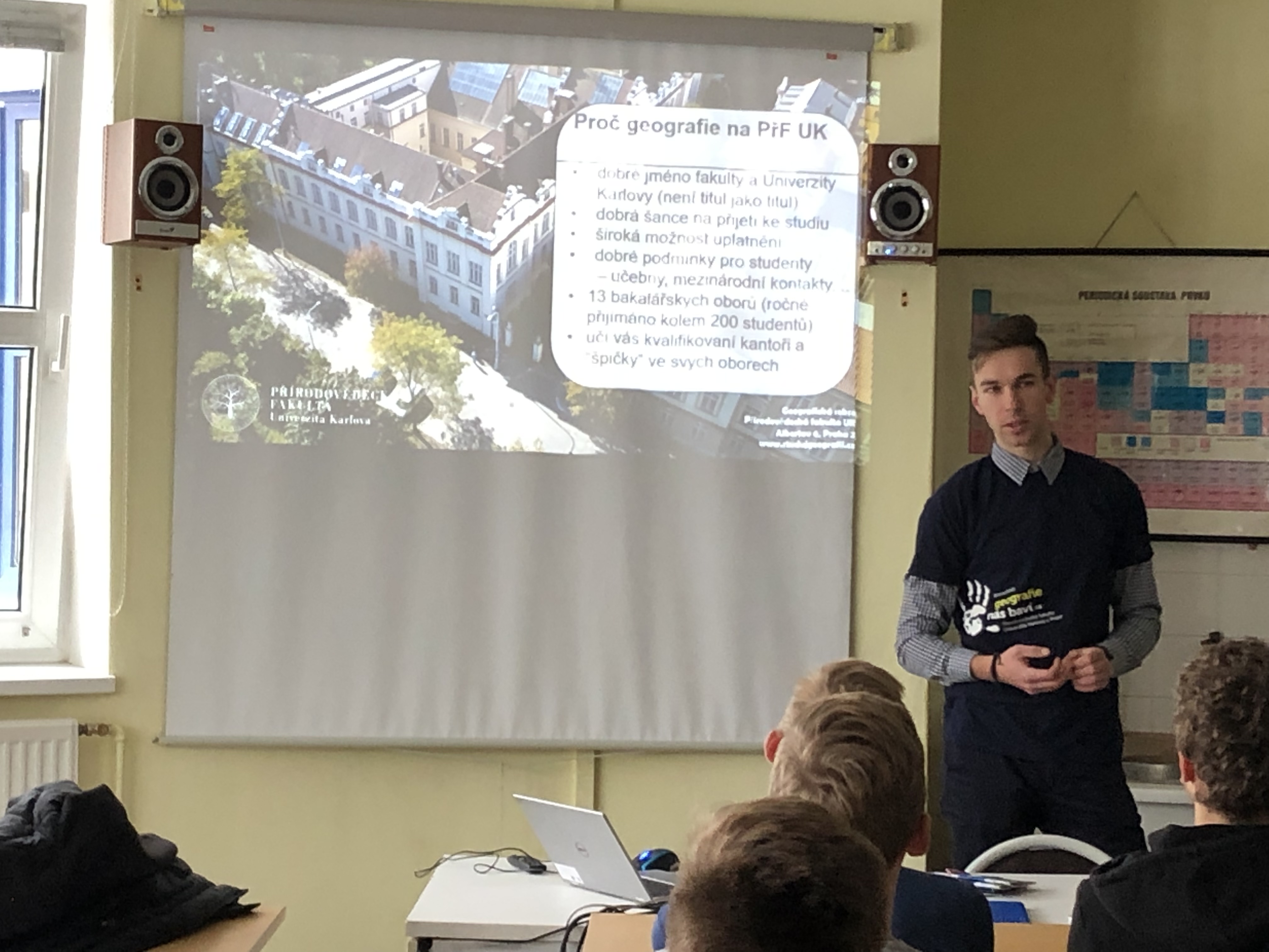 Ve středu 19. 12. proběhla pro žáky sexty a septimy informativní přednáška o možnosti studia geografie na Přírodovědecké fakultě UK. Náš bývalý student Daniel Hojovec je podrobně seznámil se všemi obory, které zde mohou studovat, a vysvětlil možnosti uplatnění geografů v praxi. Pro zpestření výklad doplnil ukázkami svých geografických prací nebo fotkami z terénních cvičení.