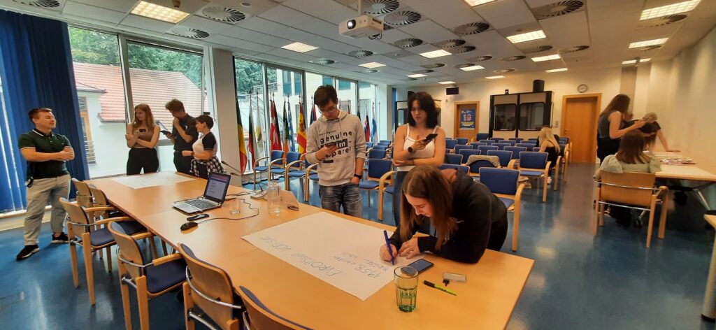 Naše další kroky pak vedli do Evropského domu poblíž Václavského náměstí, kde pro nás byl připraven program. Nejprve se studenti seznámili se stručnou historií Evropské unie. Pak došlo na hlavní orgány této organizace, kde už byli septimáni vtaženi do týmové práce. Závěrečná část se týkala studijních a pracovních příležitostí studentů v rámci zemí Evropské unie.