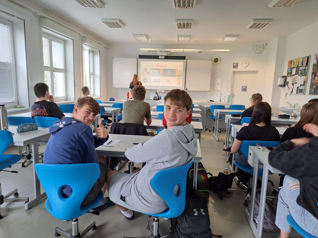 Lektorka Anička Buršová se studenty kvinty probírala algoritmy sociálních sítí, jak fungují a jak nás nutí trávit stále více času s mobilním telefonem v ruce. Jedním z cílů bylo uvědomit si důsledky tohoto chování. Studenti pak společně došli k tomu, jak se projevuje závislost na sociálních sítích a jakým způsobem lze z tohoto začarovaného kruhu vystoupit.